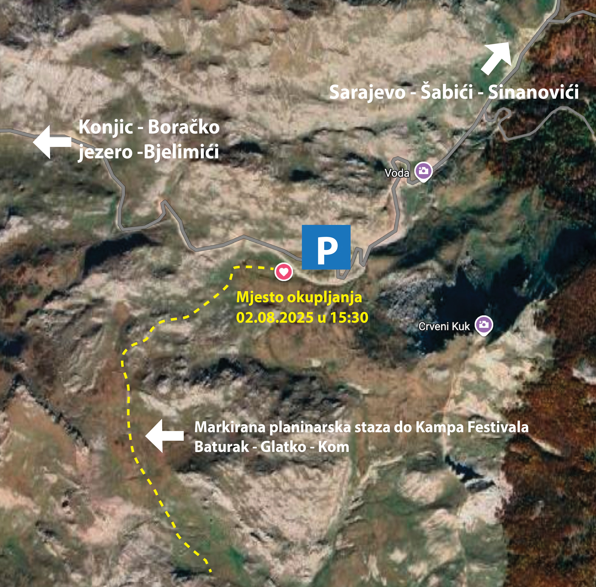 02. avgust 2025. na parkingu kod oznake markacije za vrh Baturak, pored asfaltnog puta, u 15.30 i polazak plainarskom stazom Baturak – Glatko – Kom. Na mjesto okupljanja se može doći automobilom asfaltnim putem iz dva pravca. Iz prvca Sarajeva i iz pravca Konjica.