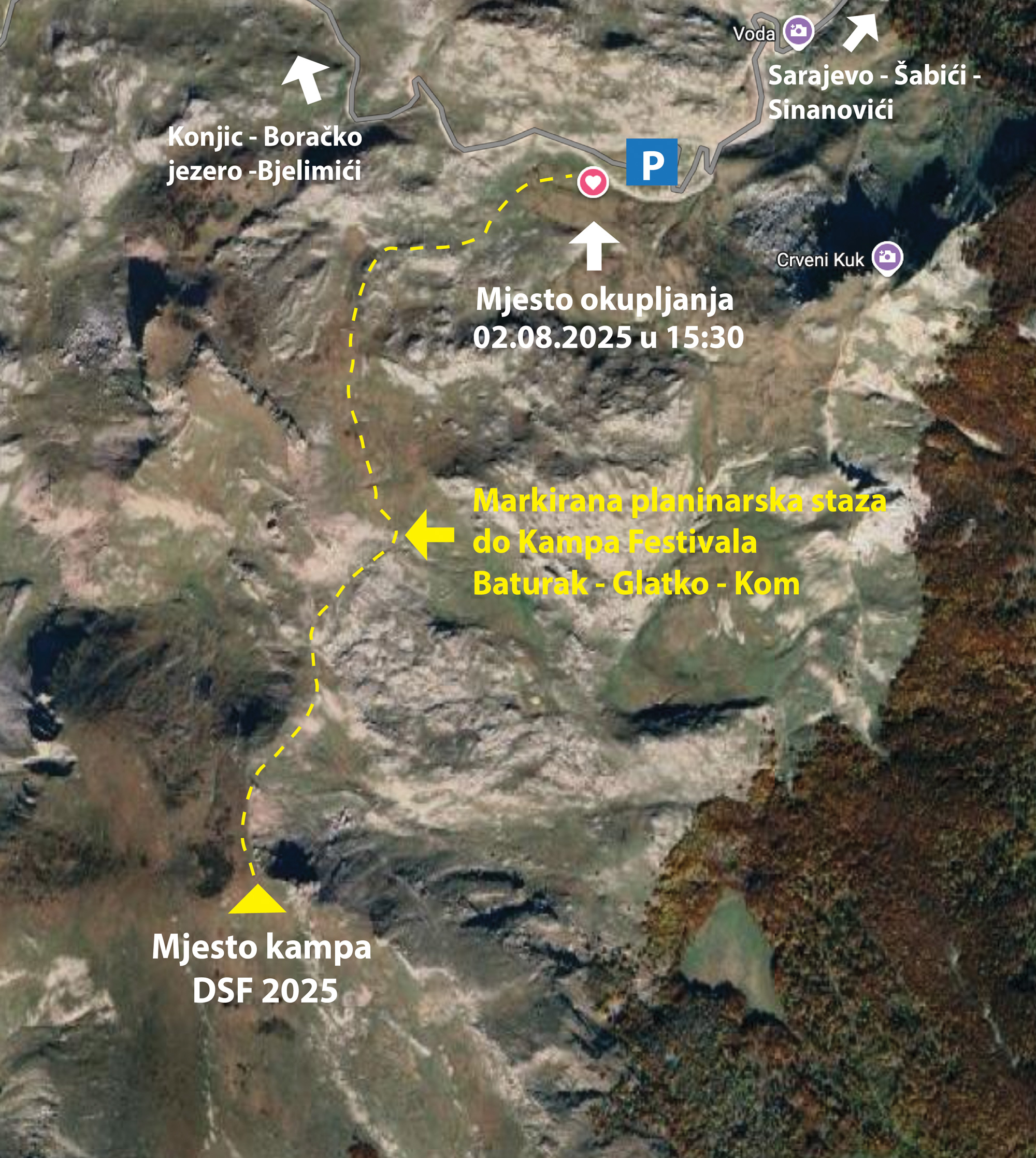 Kamp festivala nalazi se na tromeđi staza koje idu prema vrhovima Kom, Glatko i Baturak.